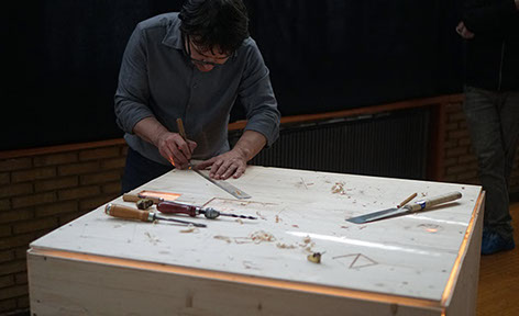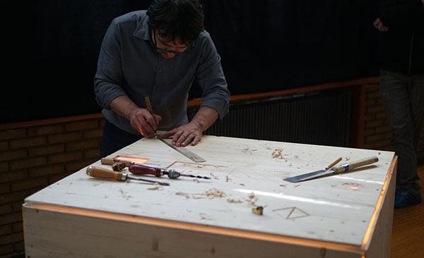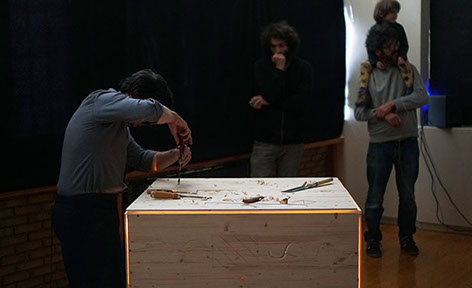 Choreographic phrases, written based on Labanotation are running across the surfaces of the cube and are inscribed in the material by the maker, thus creating new movement. His movement, its acoustical footprint, becomes the raw material of the performance.