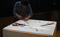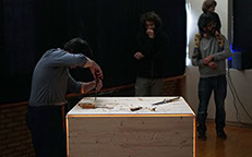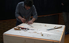 With the idea of disconnecting the movement from its purpose, we have come to some sort of deconstruction of the work of the instrument maker. Where the movement is creating the object that in turn will generate the sound (movement -> object -> sound), we came to an installation where the object, a wooden box, causes the movement which creates the sound (object -> movement and sound), and the movement instead of making, basically destroys the object.